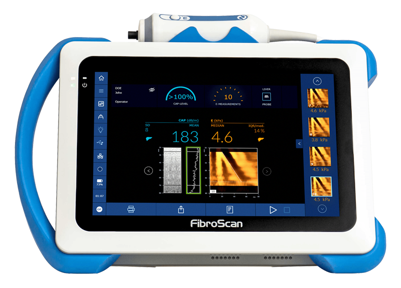 これまでは、入院して「肝生検」という痛みを伴う検査を行わなければわからなかった情報を、外来で短時間・非侵襲的に把握できるようになりました。